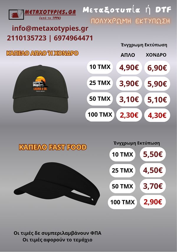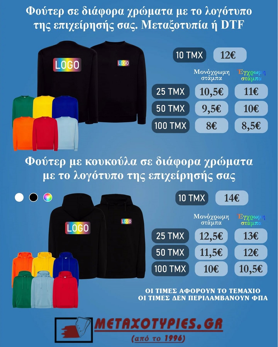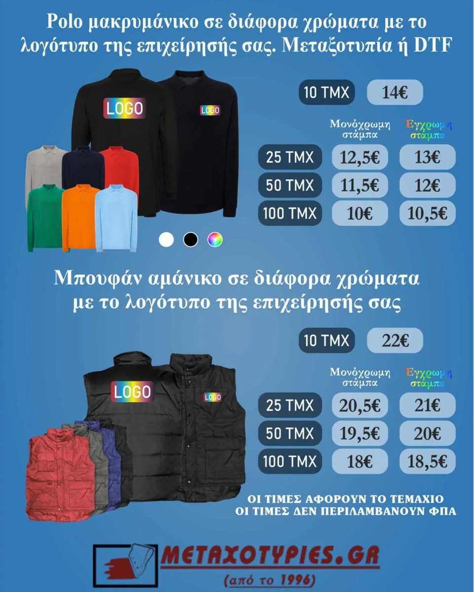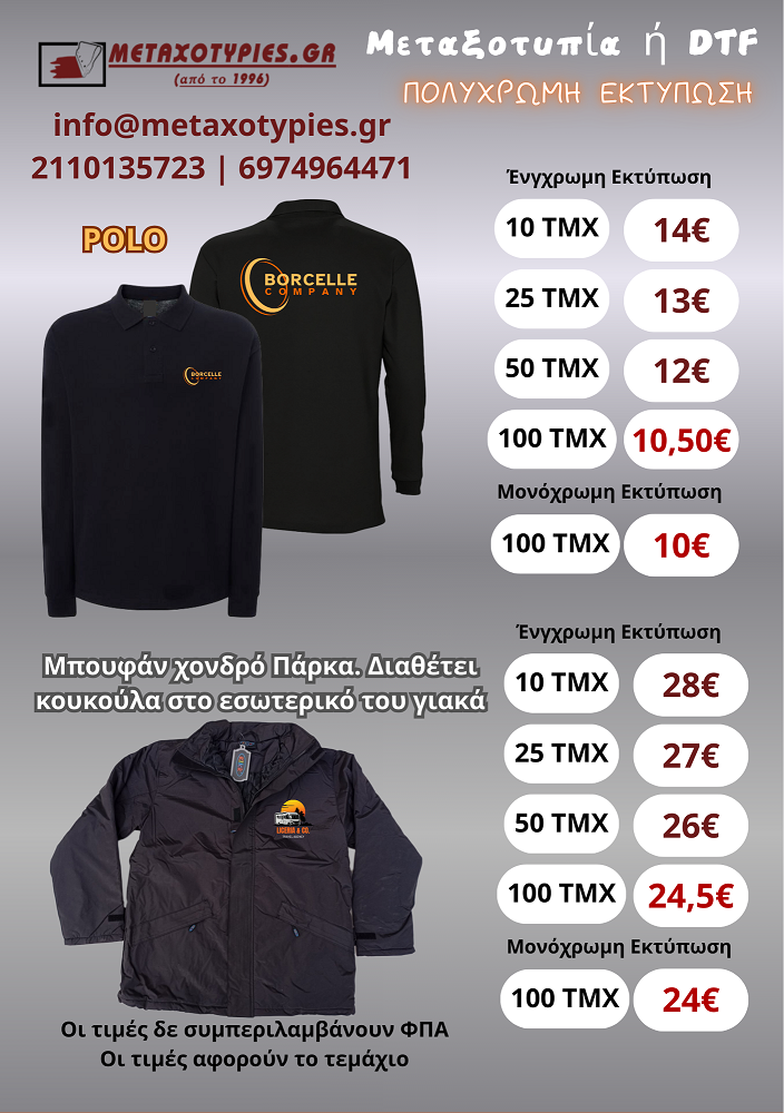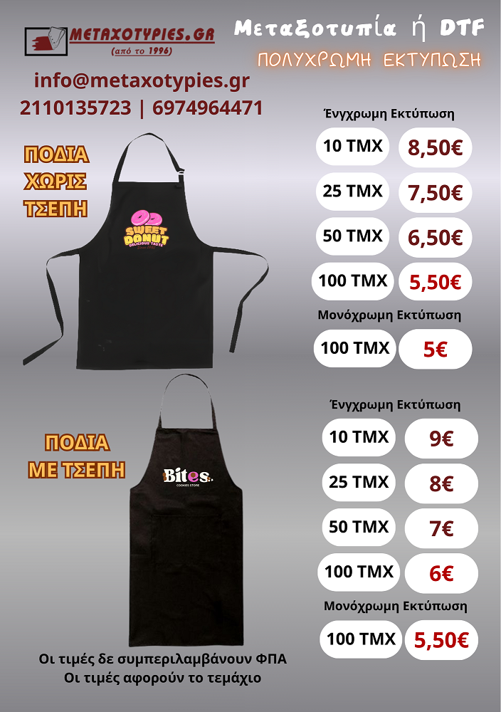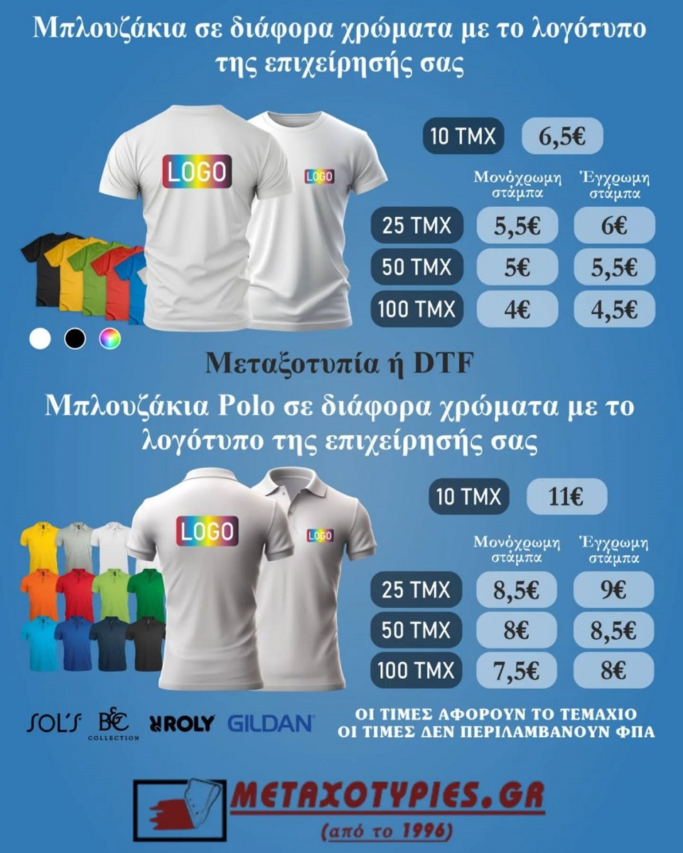 Ειδικευόμαστε στην εκτύπωση χρησιμοποιώντας ψηφιακή εκτύπωση, sublimation, pigment, offset, laser, DTF και μεταξοτυπία.